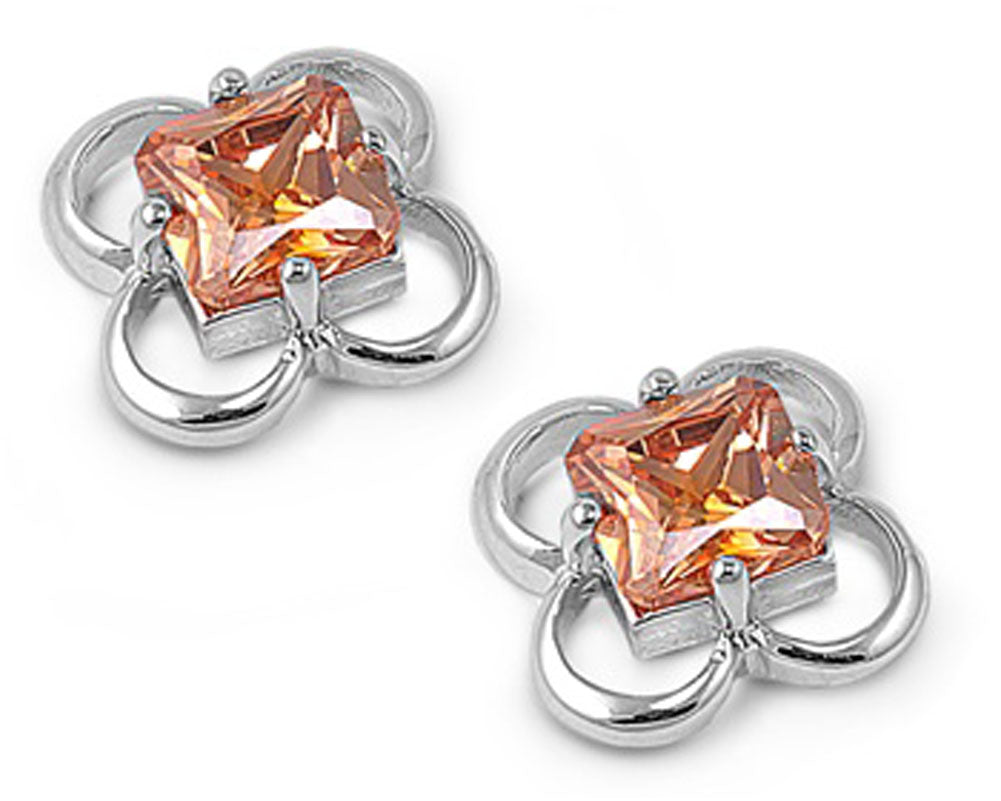 Plumeria Square Earrings Champagne Simulated CZ .925 Sterling Silver