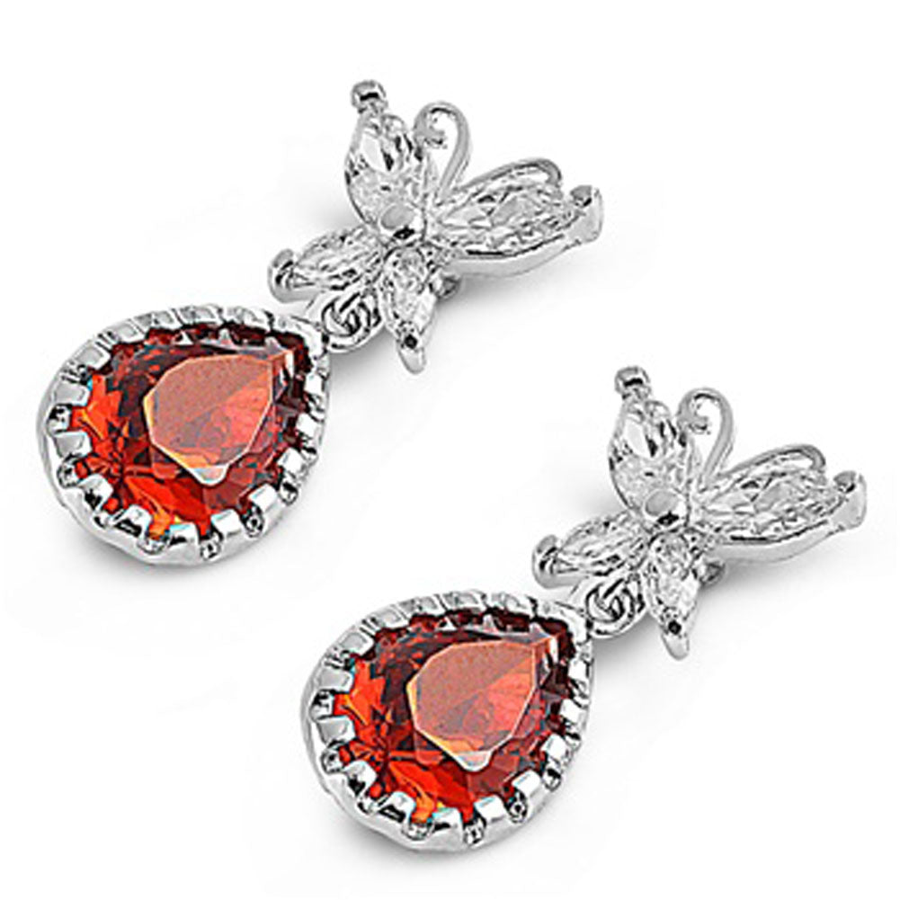 Teardrop Hanging Earrings Simulated Garnet Clear Simulated CZ .925 Sterling Silver