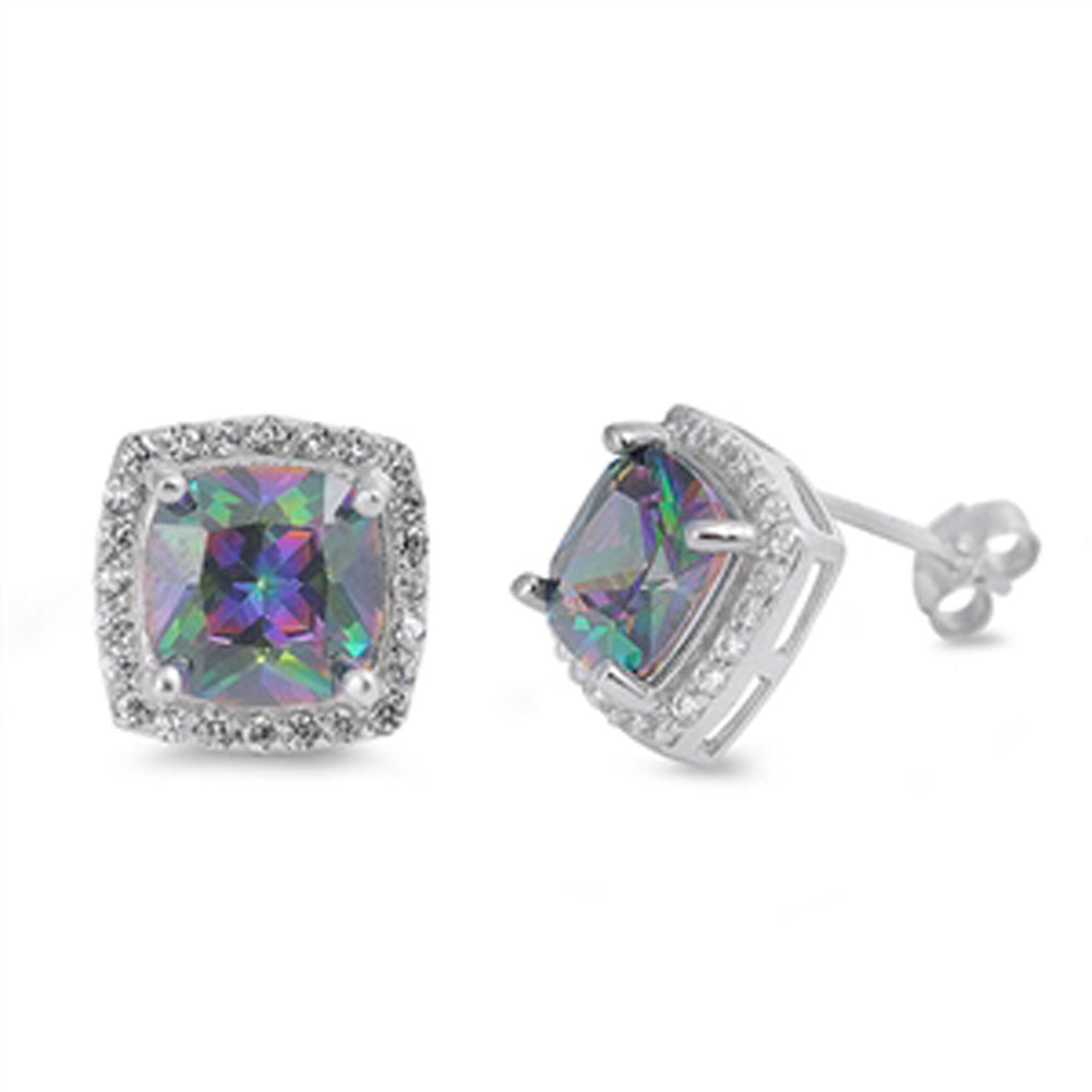 Halo Square Earrings Rainbow Simulated Topaz Clear Simulated CZ .925 Sterling Silver