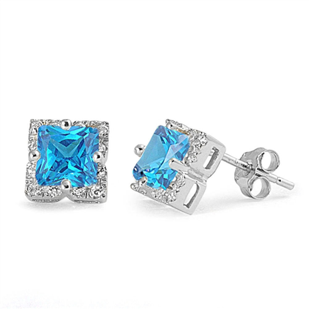 Halo Square Earrings Blue Simulated Topaz Clear Simulated CZ .925 Sterling Silver
