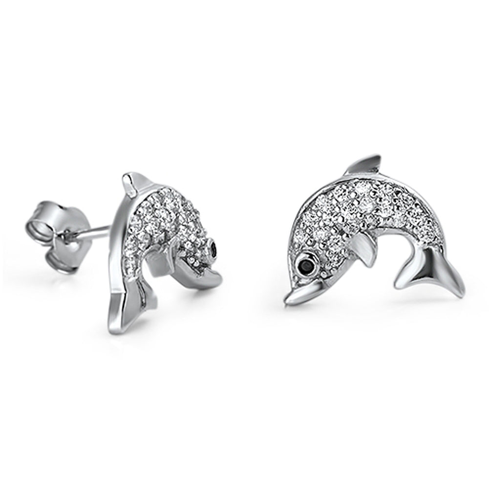 Sparkly Animal Cute Studded Dolphin Swim Clear Simulated CZ .925 Sterling Silver Earrings