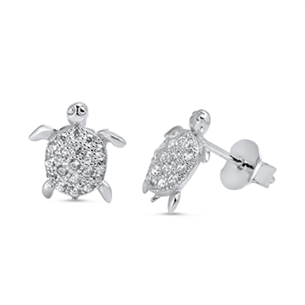 Animal Tiny Studded Turtle Cute Clear Simulated CZ .925 Sterling Silver Earrings