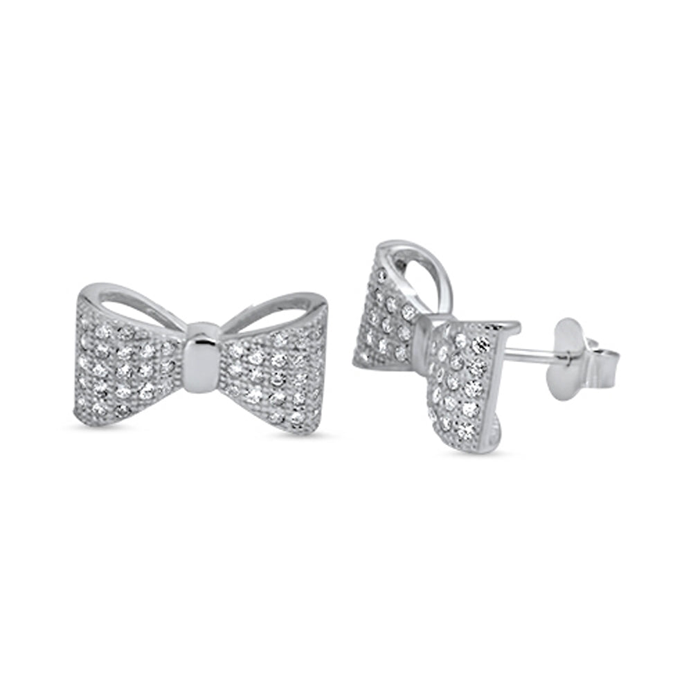 Knot Studded Bow Ribbon Clear Simulated CZ .925 Sterling Silver Girly Earrings