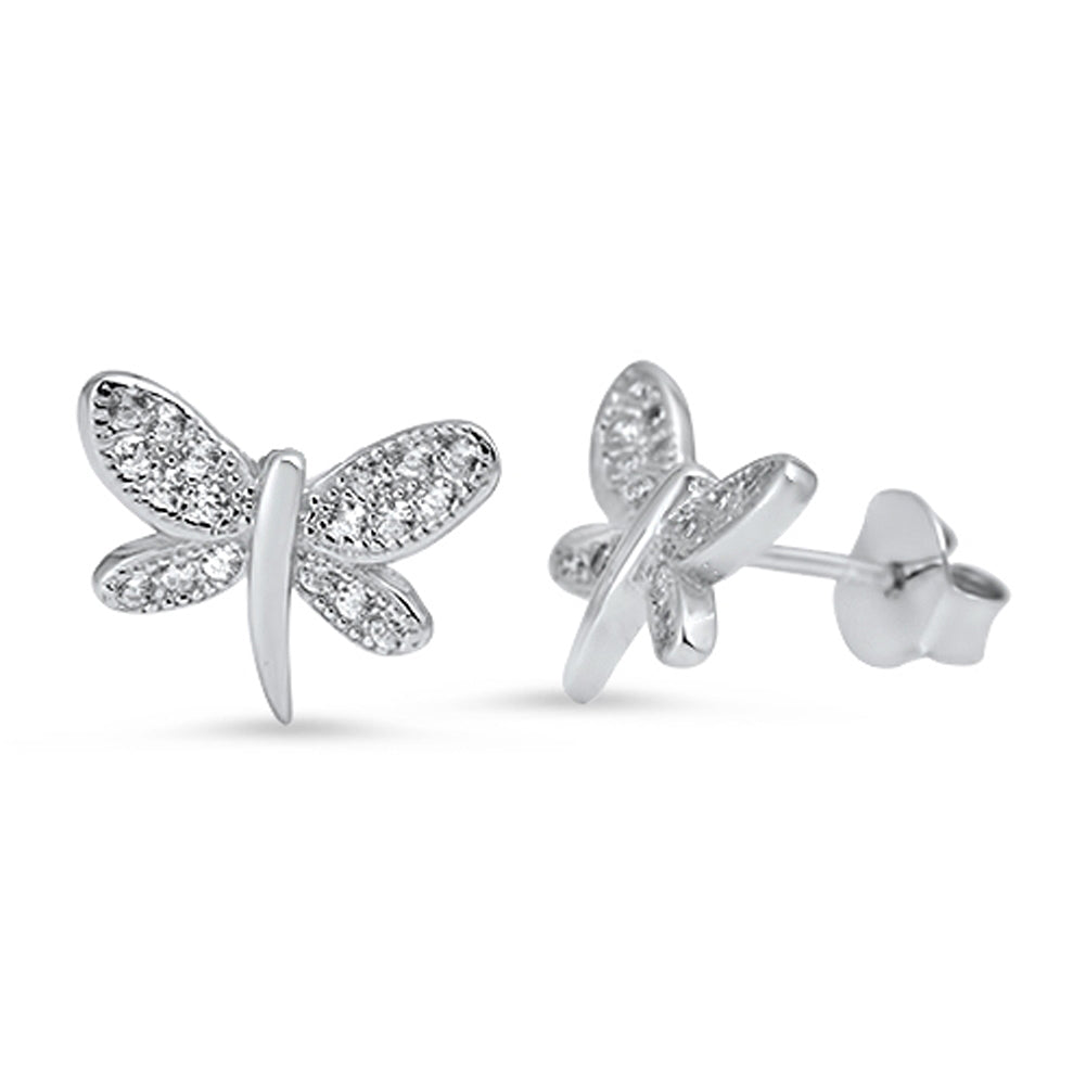 Bug Simple Studded Dragonfly Cute Clear Simulated CZ .925 Sterling Silver Earrings
