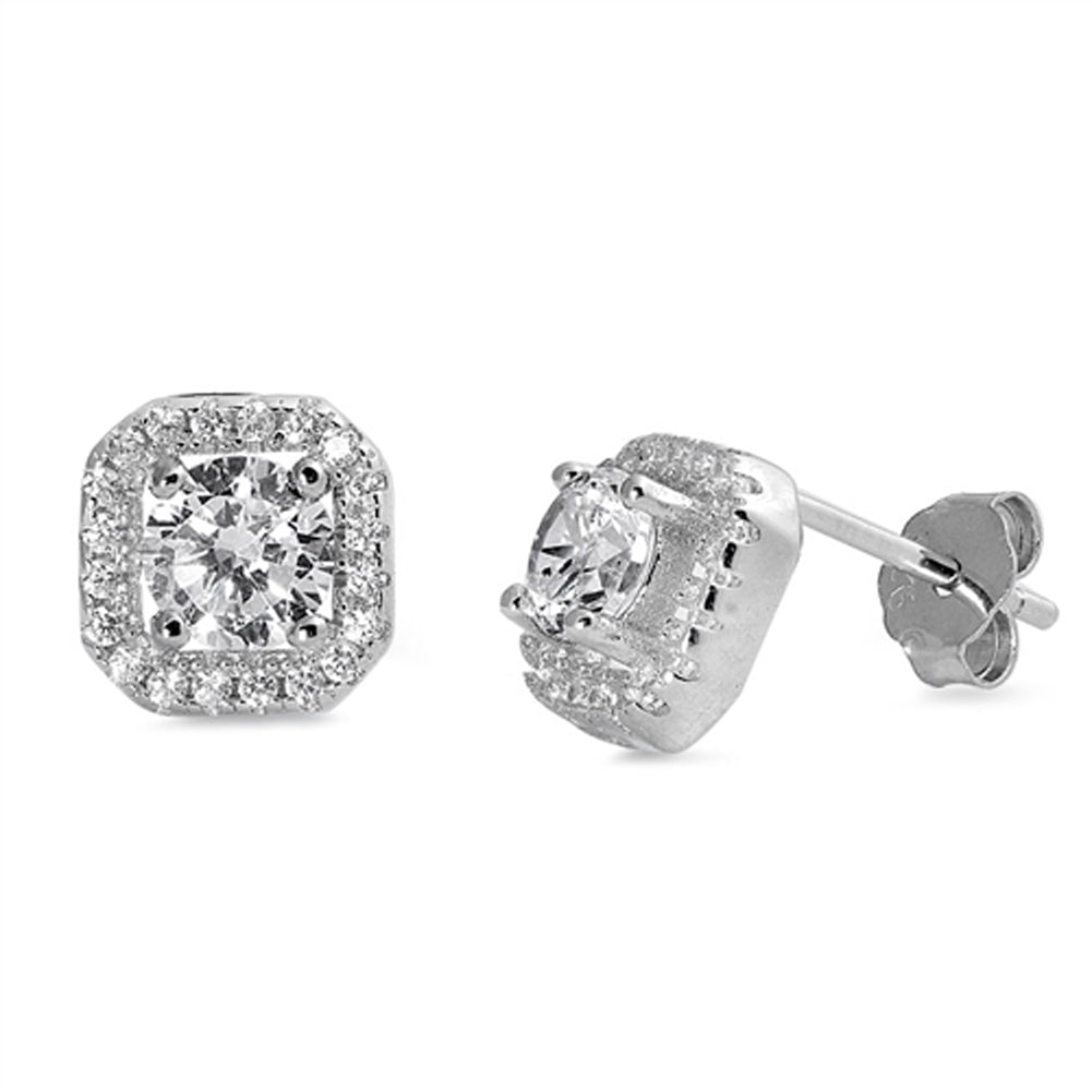 Sparkly Studded Square Classic Clear Simulated CZ .925 Sterling Silver Earrings