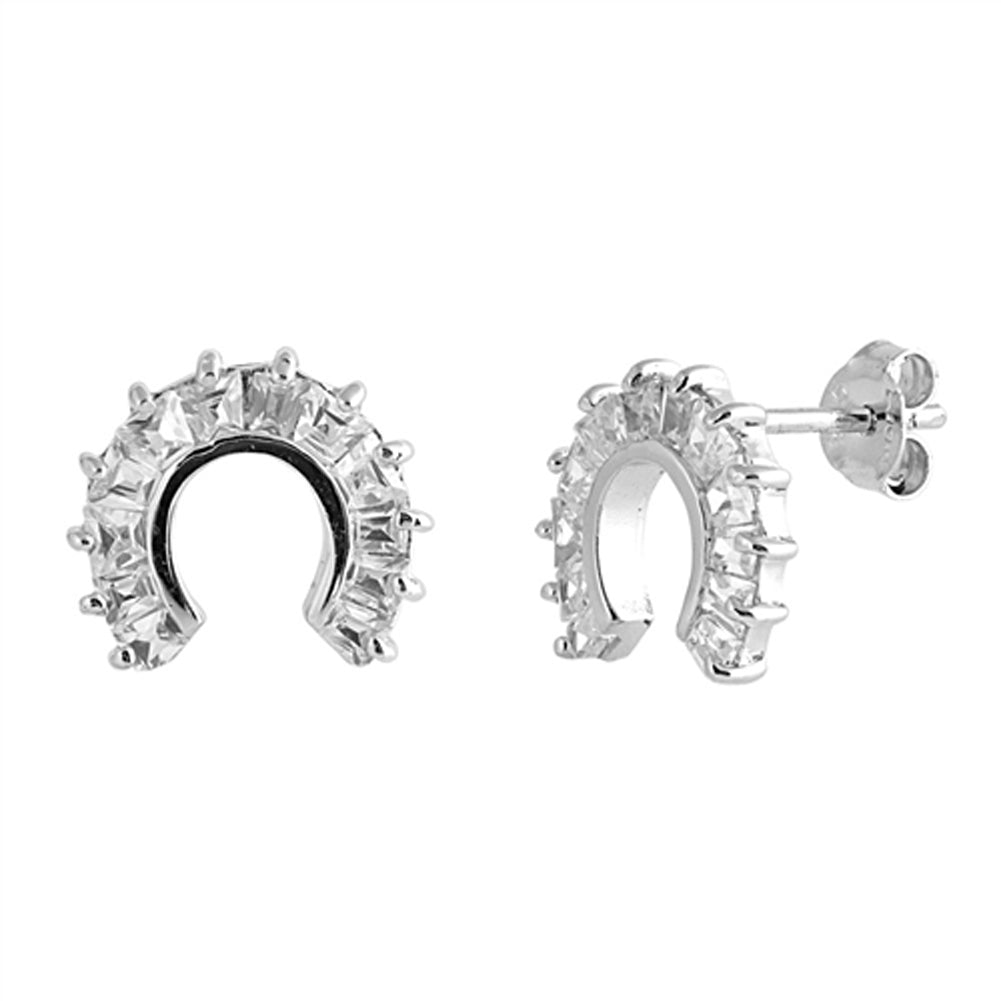 Animal Bold Sparkly Burst Horseshoe Country Clear Simulated CZ .925 Sterling Silver Earrings