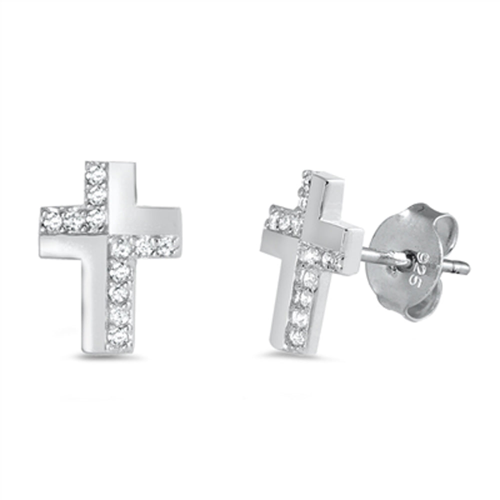 Sterling Silver High Polish Cross Studded Modern Simple Earrings Clear CZ 925