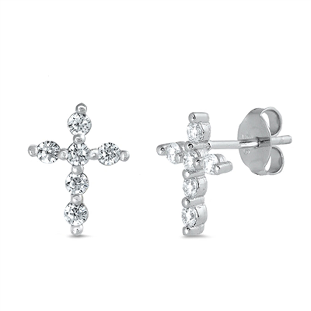 Sterling Silver Simple Cross Elegant Studded Traditional Earrings Clear CZ 925