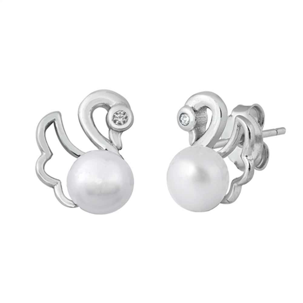 Sterling Silver Cute Bird Swan Animal Cute Earrings Freshwater Pearl Clear CZ