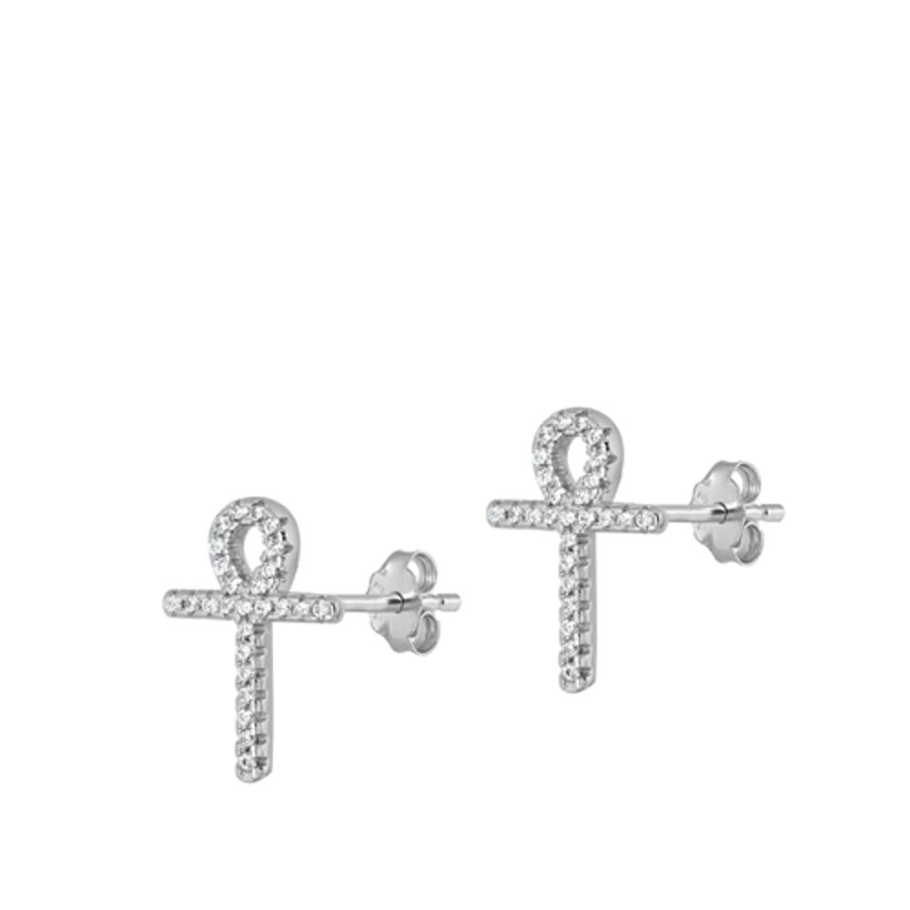 Sterling Silver Religious Egyptian Ankh Cross Clear CZ Stud Earrings 925 New