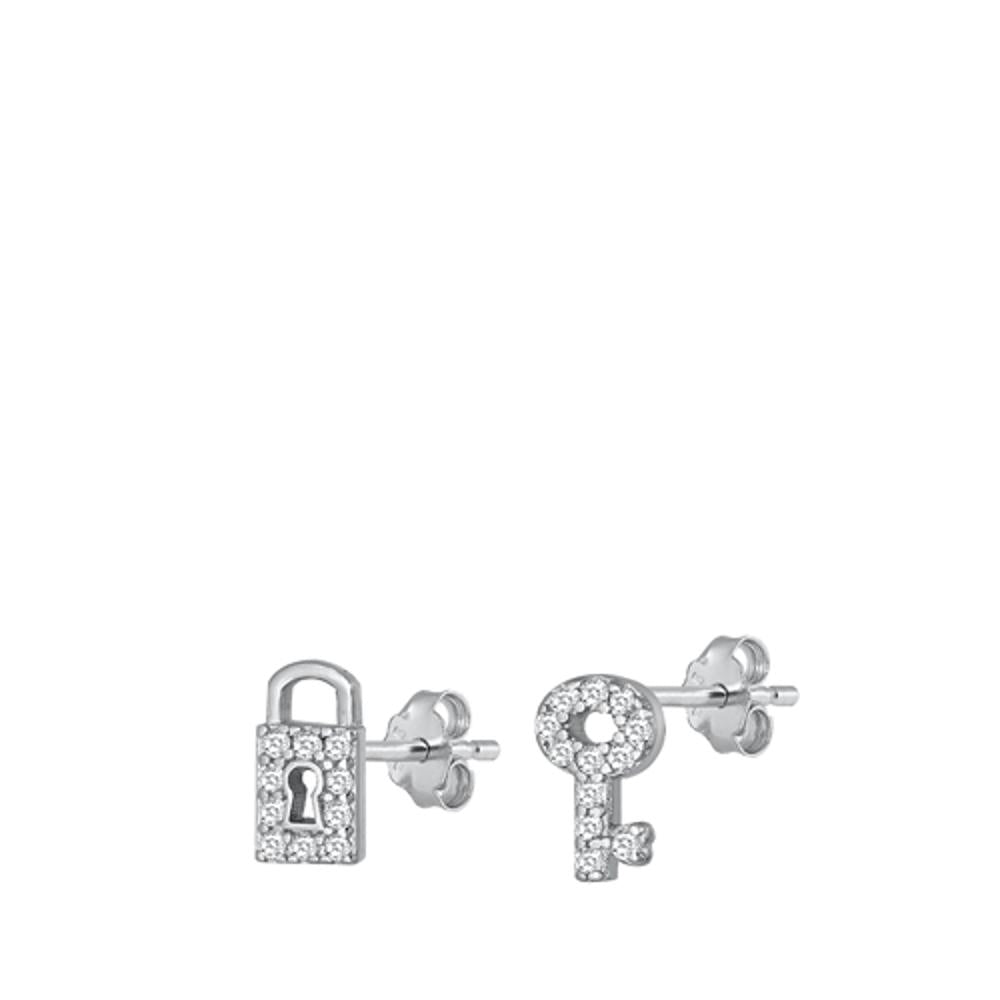 Sterling Silver Beautiful Clear CZ Lock & Key Stud High Polished Earrings 925