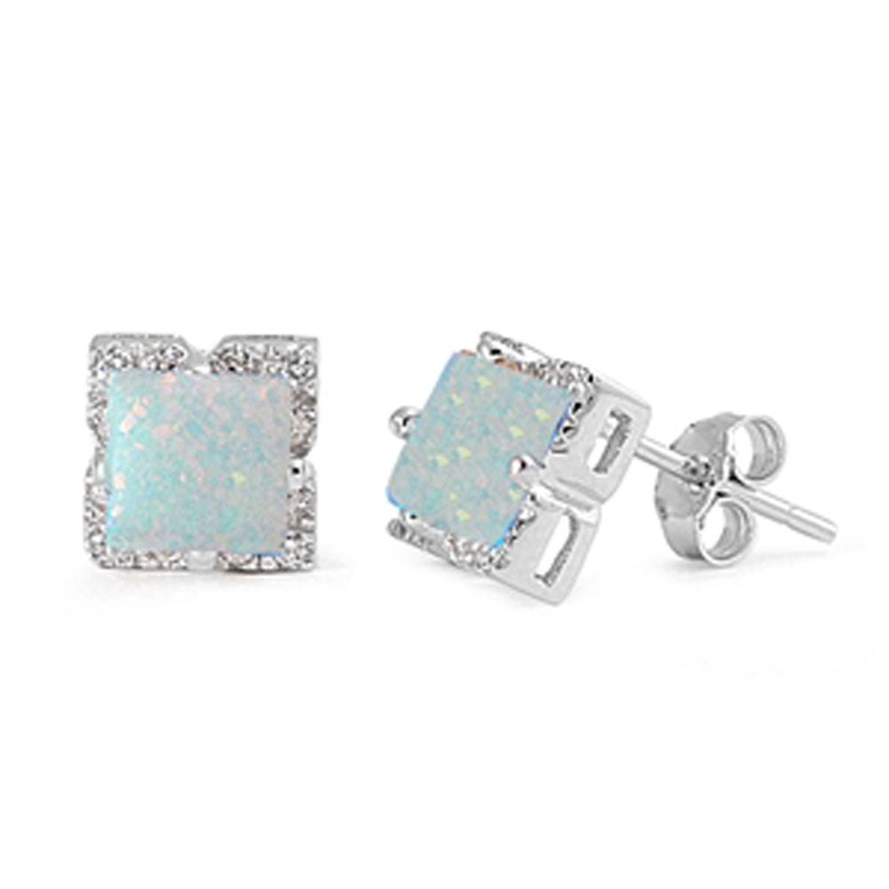 Halo Square Earrings White Simulated Opal Clear Simulated CZ .925 Sterling Silver