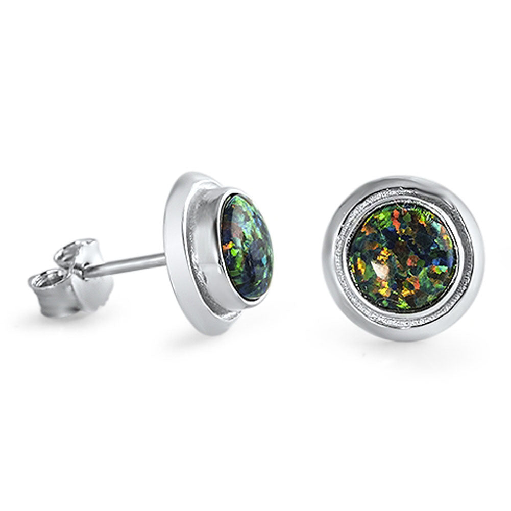 Round Bezel Earrings Mystic Simulated Opal .925 Sterling Silver