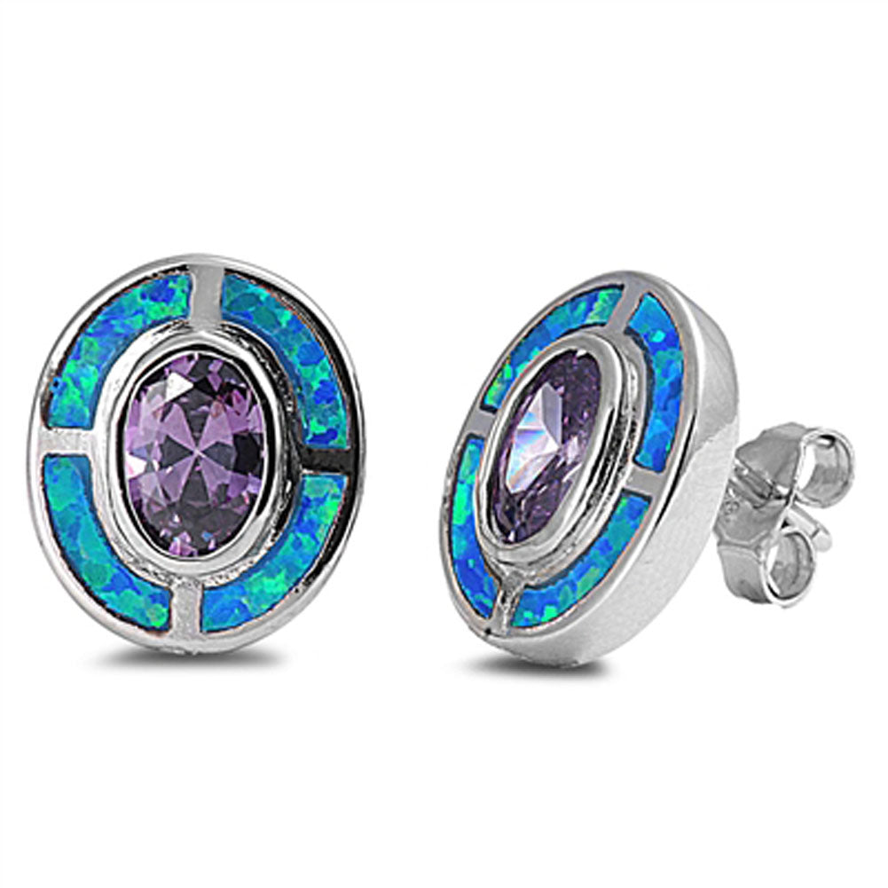 Halo Oval Earrings Simulated Amethyst Blue Simulated Opal .925 Sterling Silver