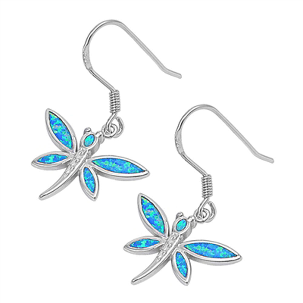 Dragonfly Hanging Earrings Blue Simulated Opal .925 Sterling Silver
