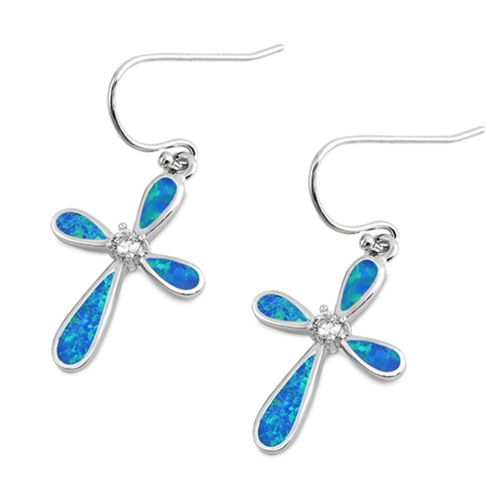 Cross Earrings Blue Simulated Opal Clear Simulated CZ .925 Sterling Silver