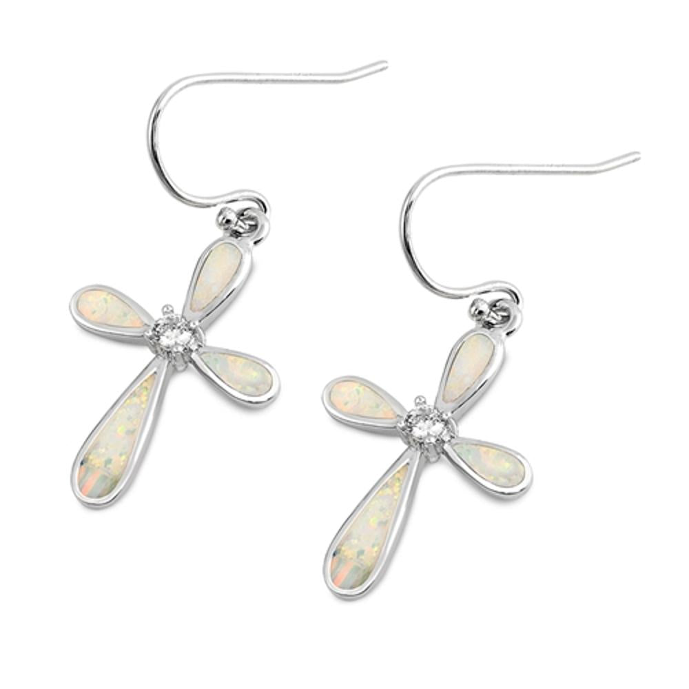 Cross Earrings White Simulated Opal Clear Simulated CZ .925 Sterling Silver