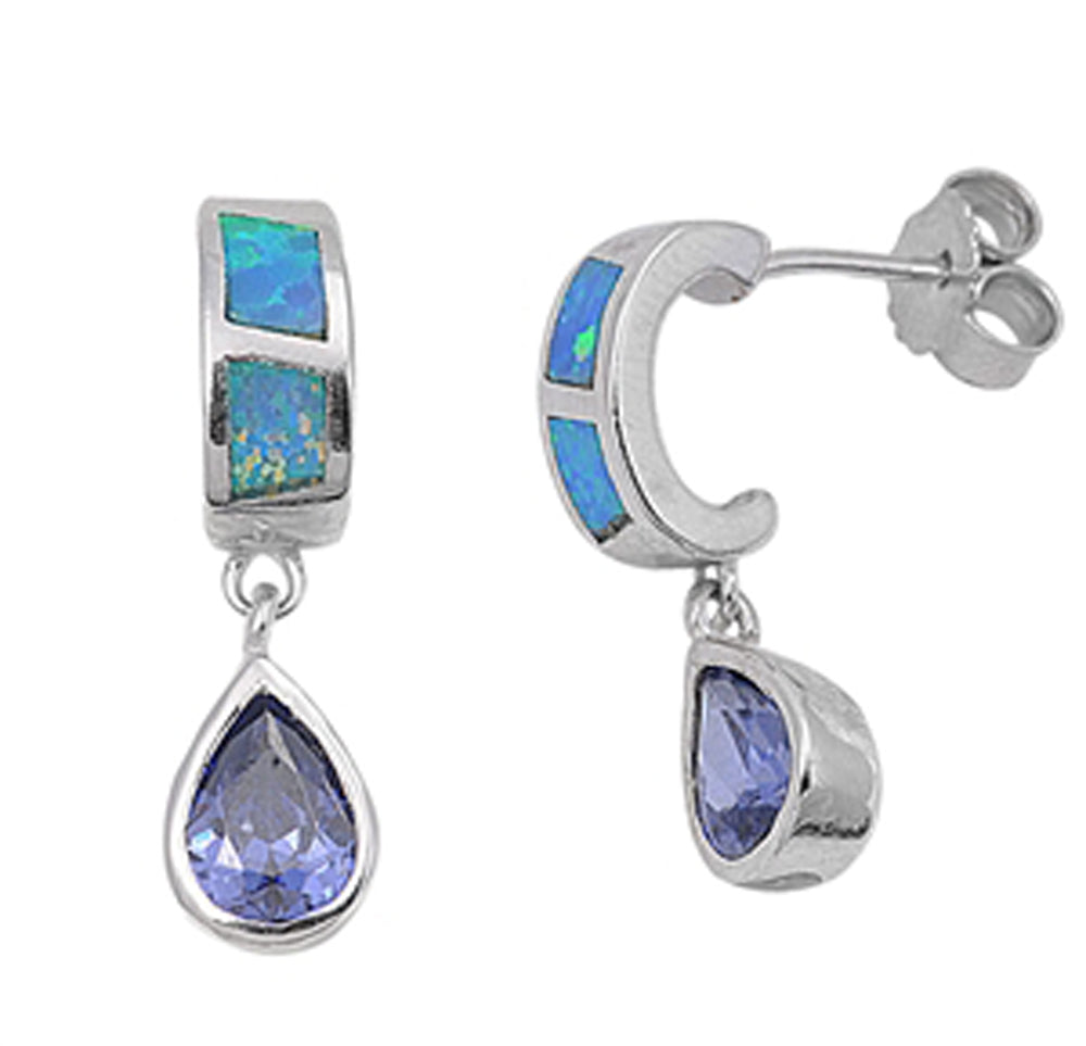Sterling Silver Dangle Teardrop Earrings Blue Synthetic Opal Blue Sapphire CZ