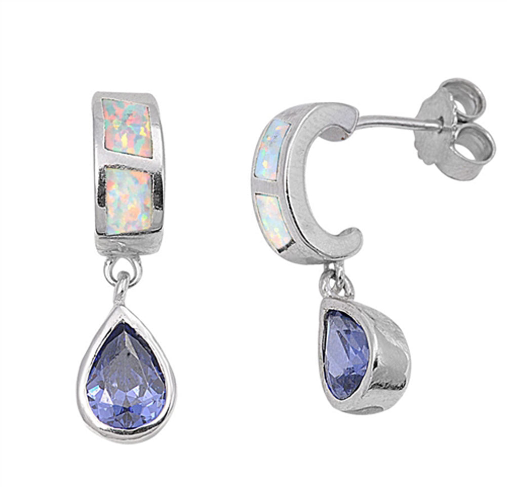 Modern Curve Teardrop Dangle White Simulated Opal Blue Simulated Sapphire .925 Sterling Silver Earrings