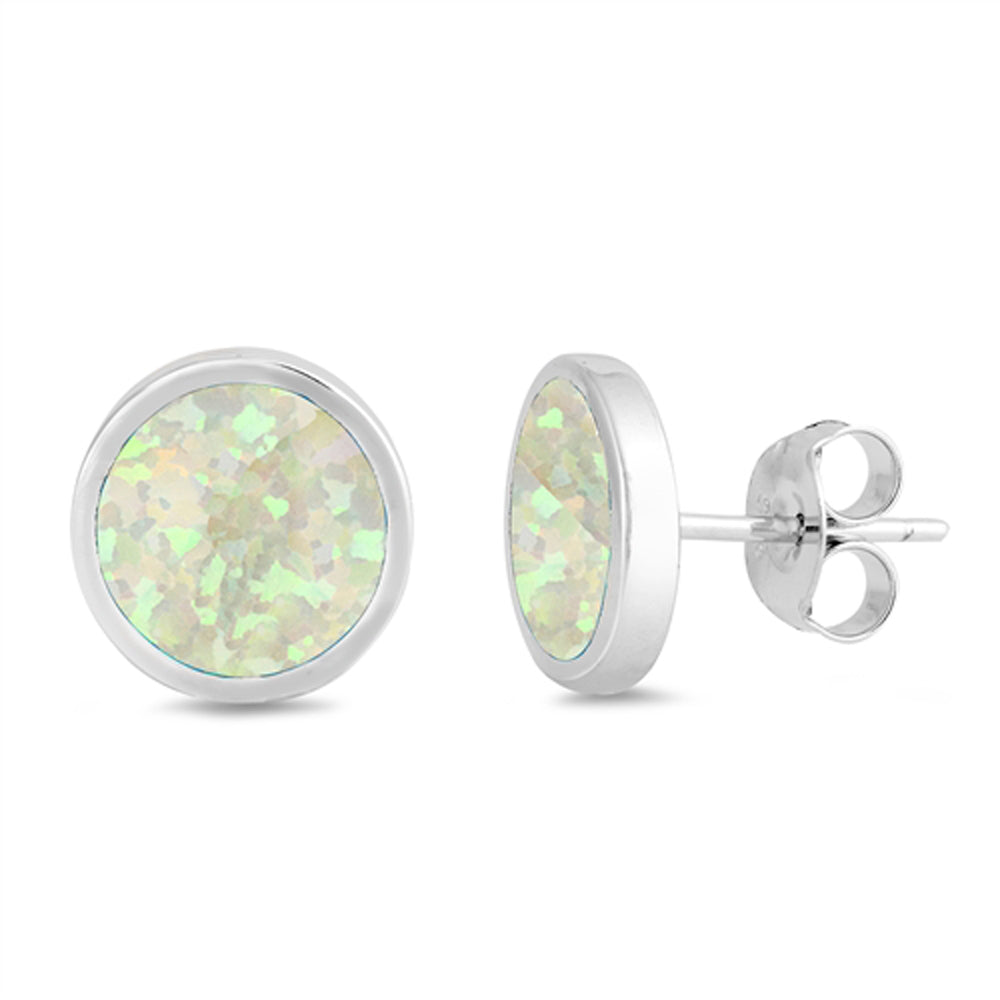 Sterling Silver High Polish Circle Round Classic White Synthetic Opal Earrings