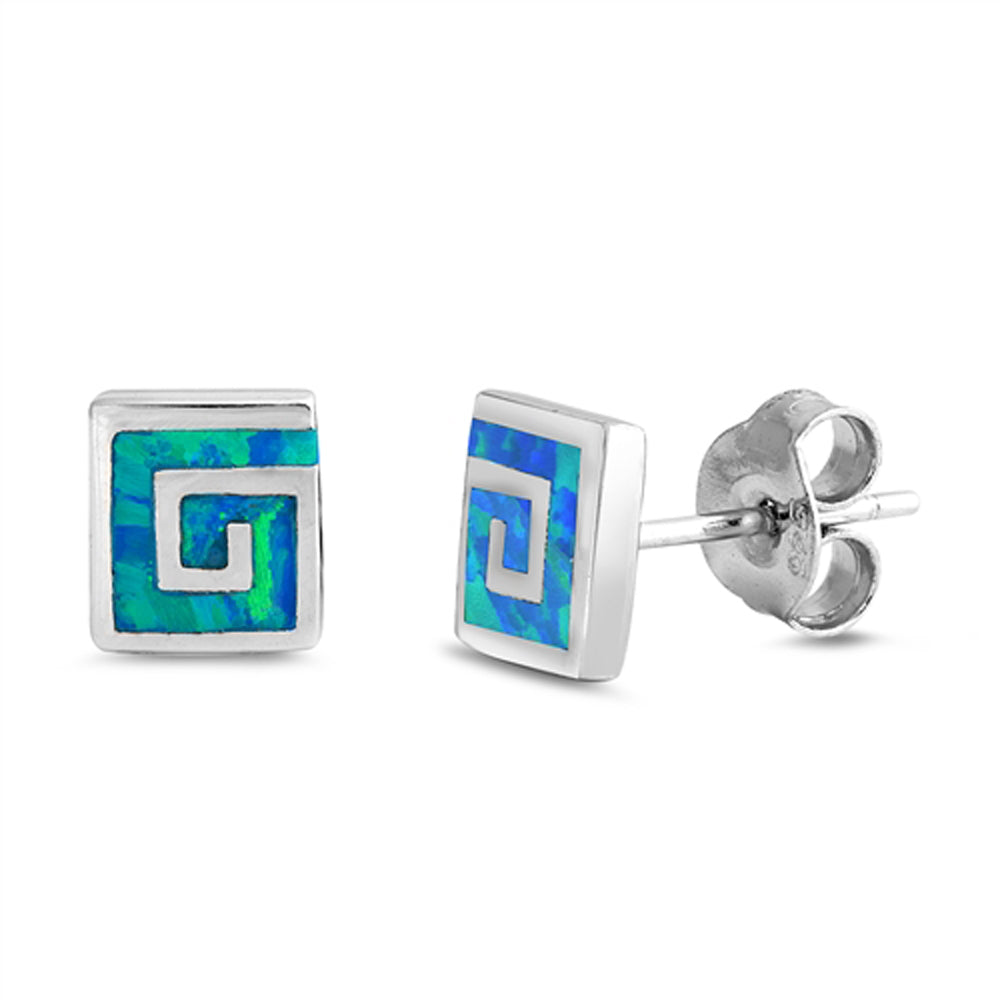 Sterling Silver Greek Key Unique Mosaic Modern Earrings Blue Synthetic Opal 925
