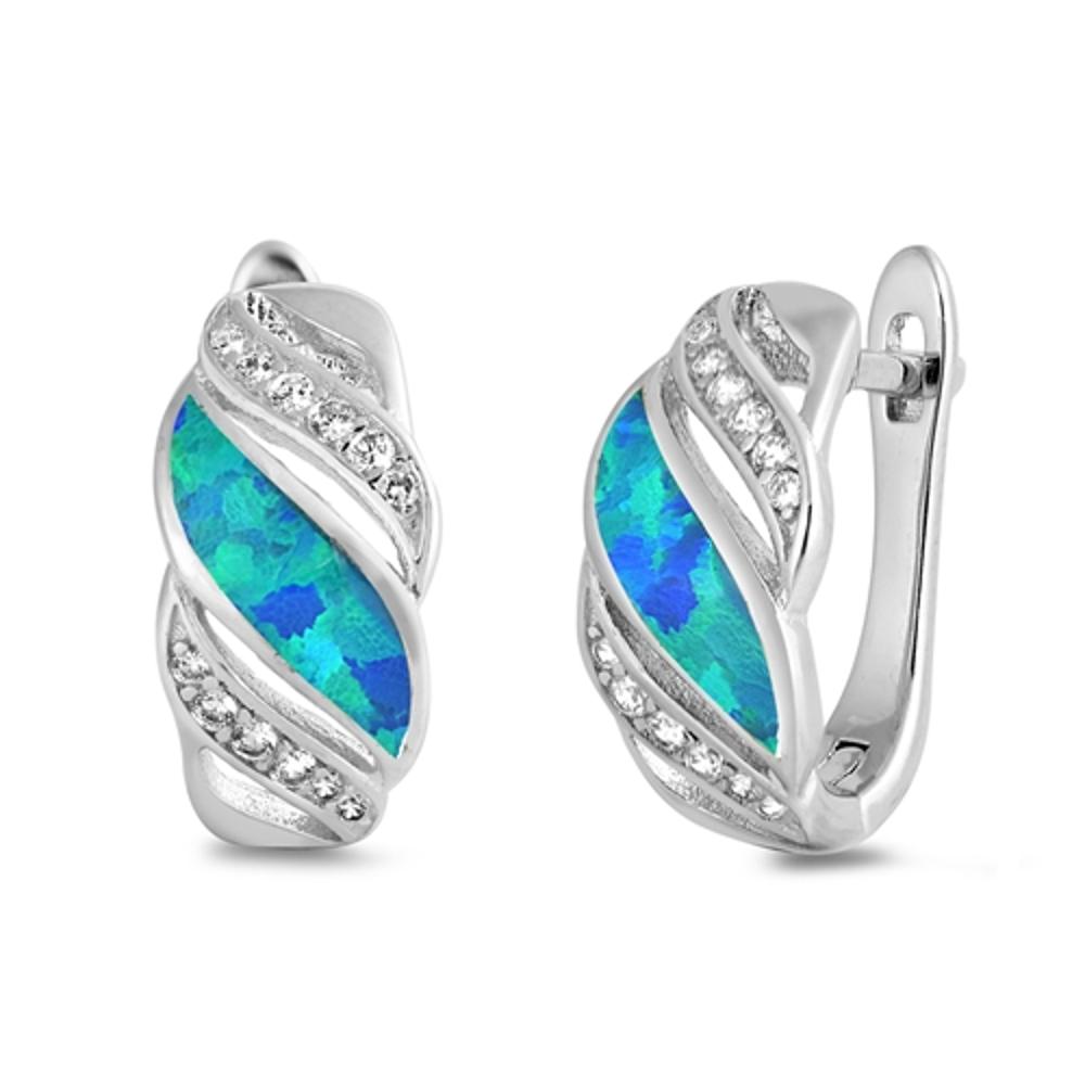 Blue Opal Clear CZ Lever Back Hoop High Polished Earrings Sterling Silver 925