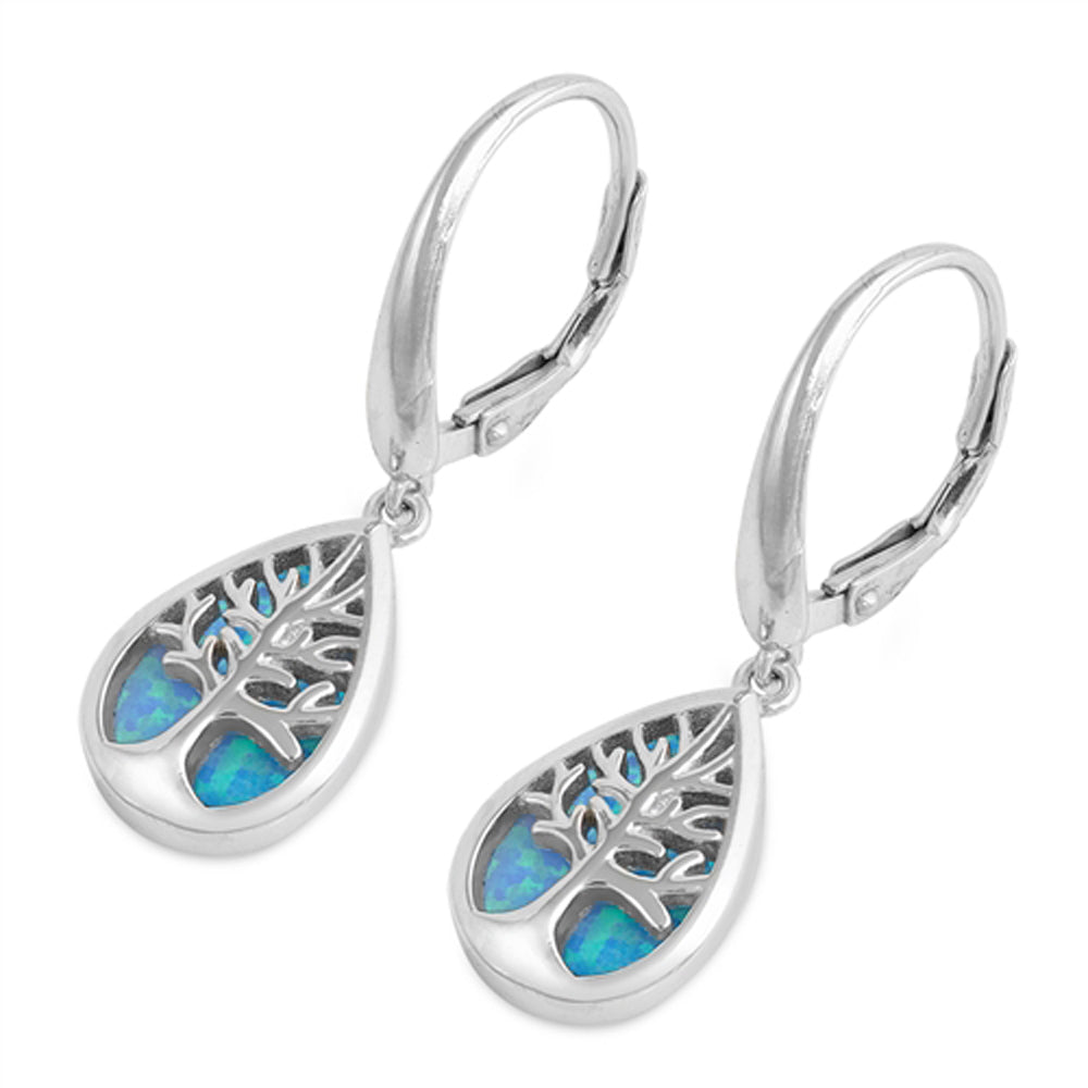 Sterling Silver Polished Tree of Life Cutout Teardrop Earrings Blue Synthetic Opal