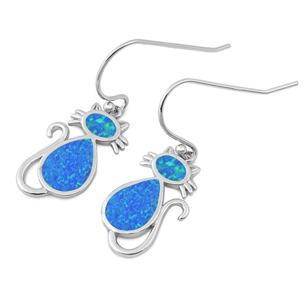 Sterling Silver Cat Kitten Animal Cute Pet Earrings Blue Synthetic Opal 925 New