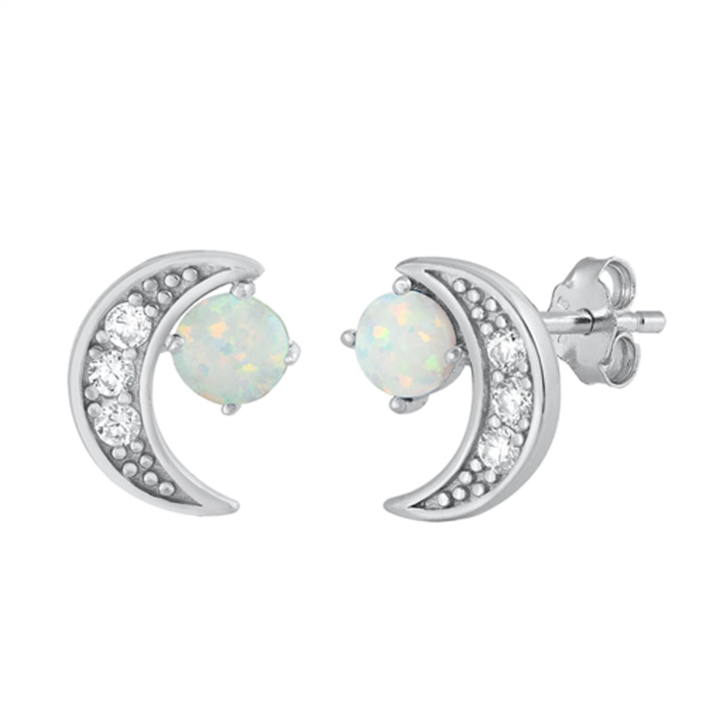 Sterling Silver Crescent Moon Studded Earrings White Synthetic Opal Clear CZ 925