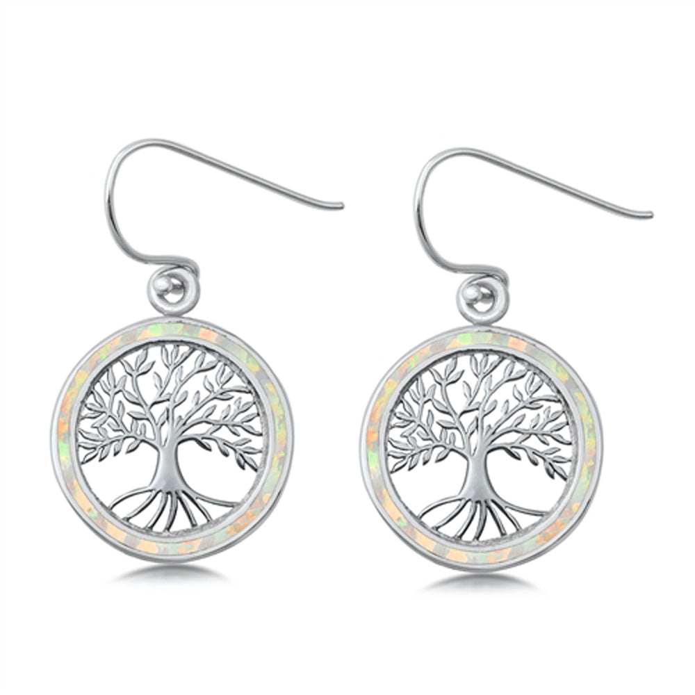 Sterling Silver Tree of Life Nature Round Earrings White Synthetic Opal 925 New