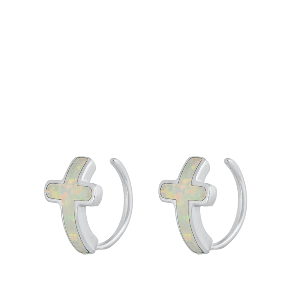 Sterling Silver Cross Hoop Modern High Polish Earrings White Synthetic Opal 925