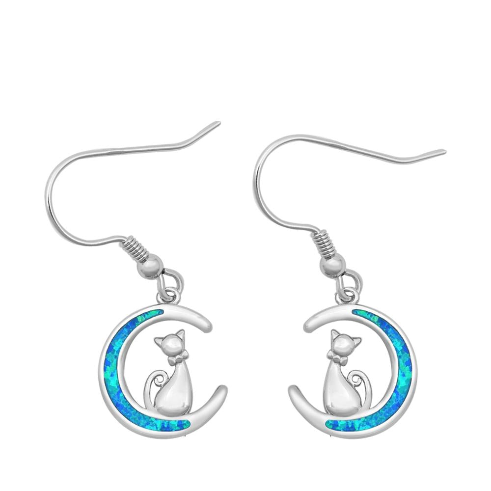Sterling Silver Cat On Moon Drop Dangle Wired Hook Earrings Blue Opal 925 New
