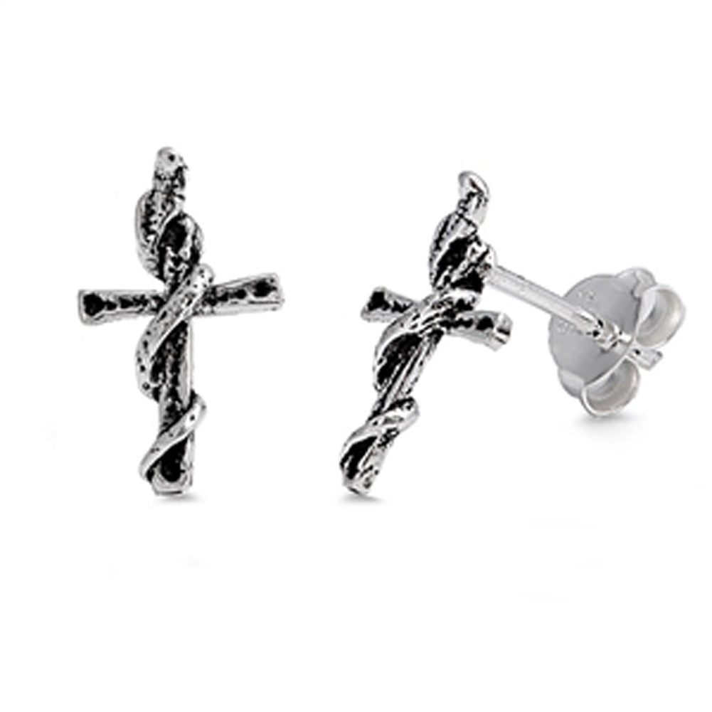 Ornate Woodgrain Vine Cross Religious .925 Sterling Silver Crucifix Detailed Stud Earrings