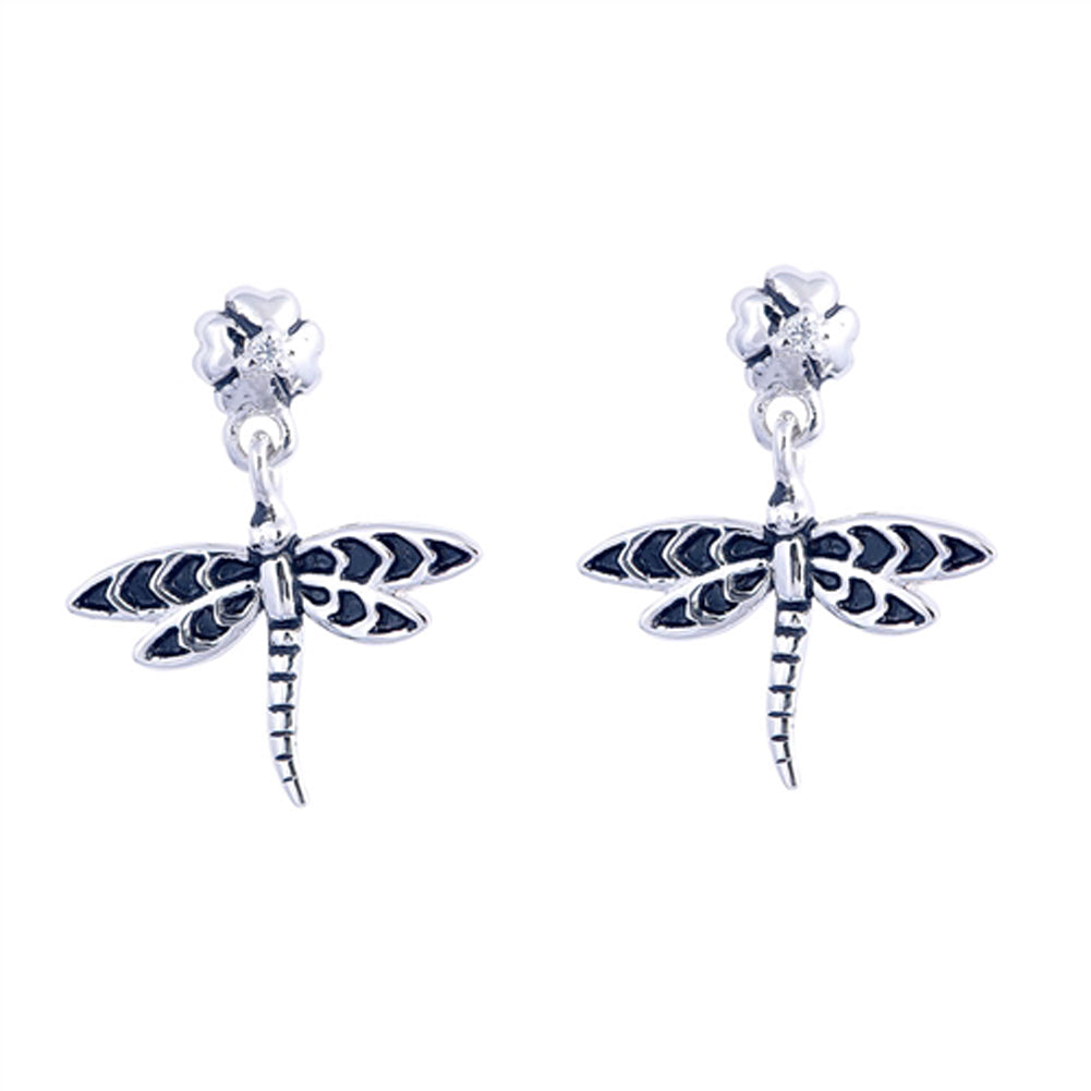 Oxidized Wing Dragonfly Flower Dangle Insect .925 Sterling Silver Bug Stud Earrings
