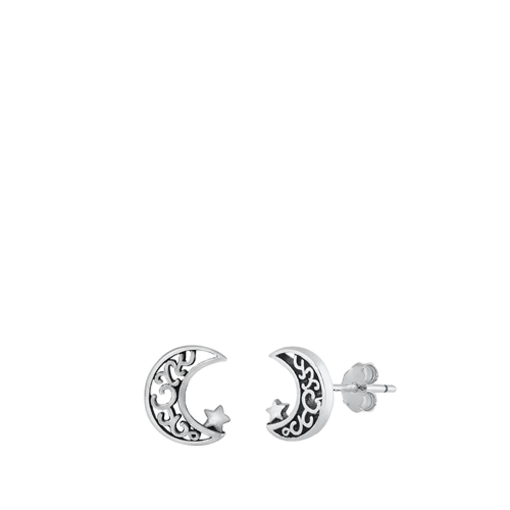 Sterling Silver Filigree Moon & Star Stud Earrings Oxidized Half Moon 925 New