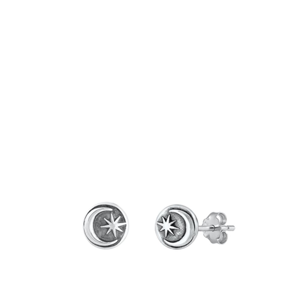 Sterling Silver High Polished Oxidized Star Moon Stud Earrings 925 New