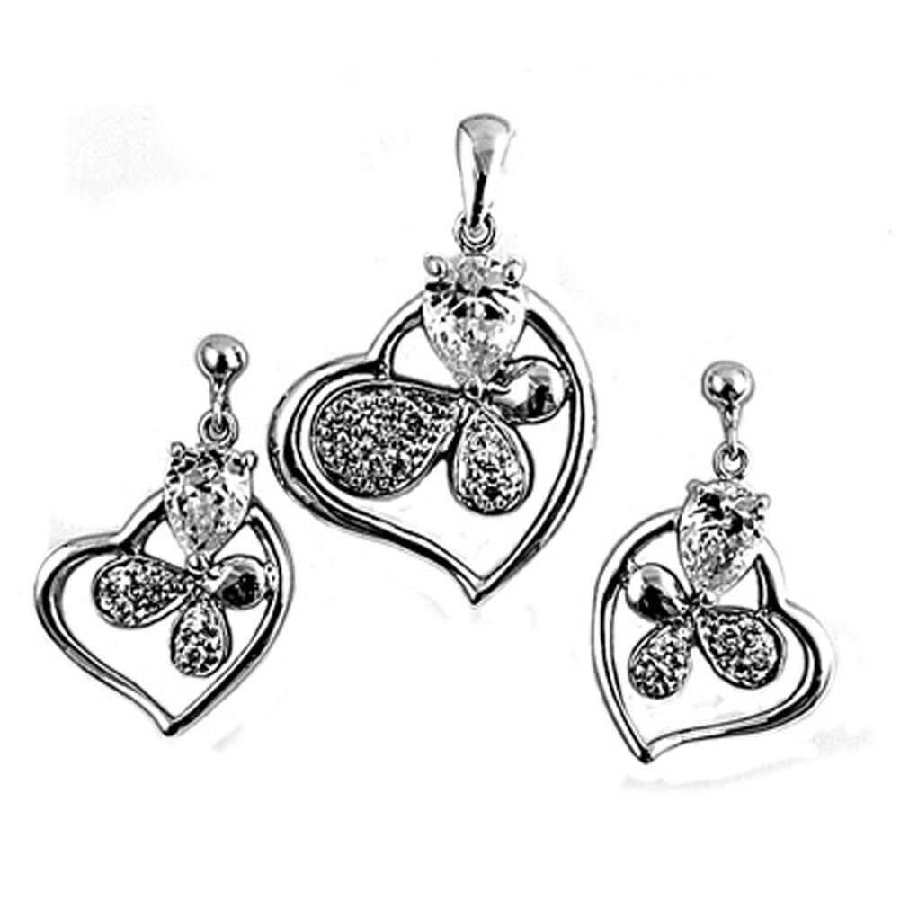 Heart Teardrop Earrings Clear Simulated CZ .925 Sterling Silver Pendant Set