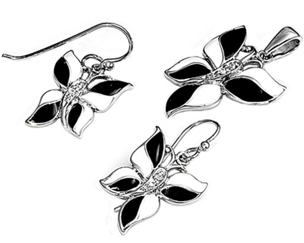 Butterfly Earrings Black Simulated Onyx Simulated Mother of Pearl .925 Sterling Silver Pendant Set