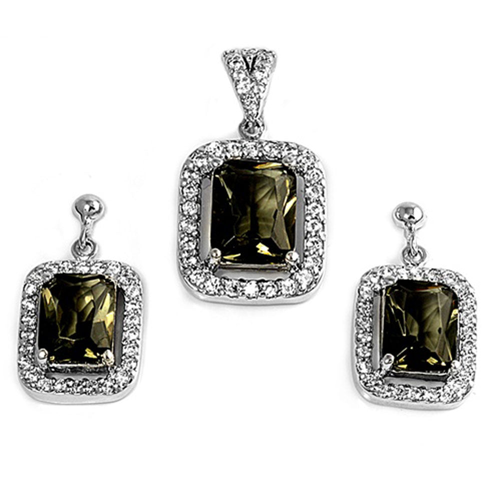 Halo Rectangle Earrings Olive Green Simulated CZ Clear Simulated CZ .925 Sterling Silver Pendant Set