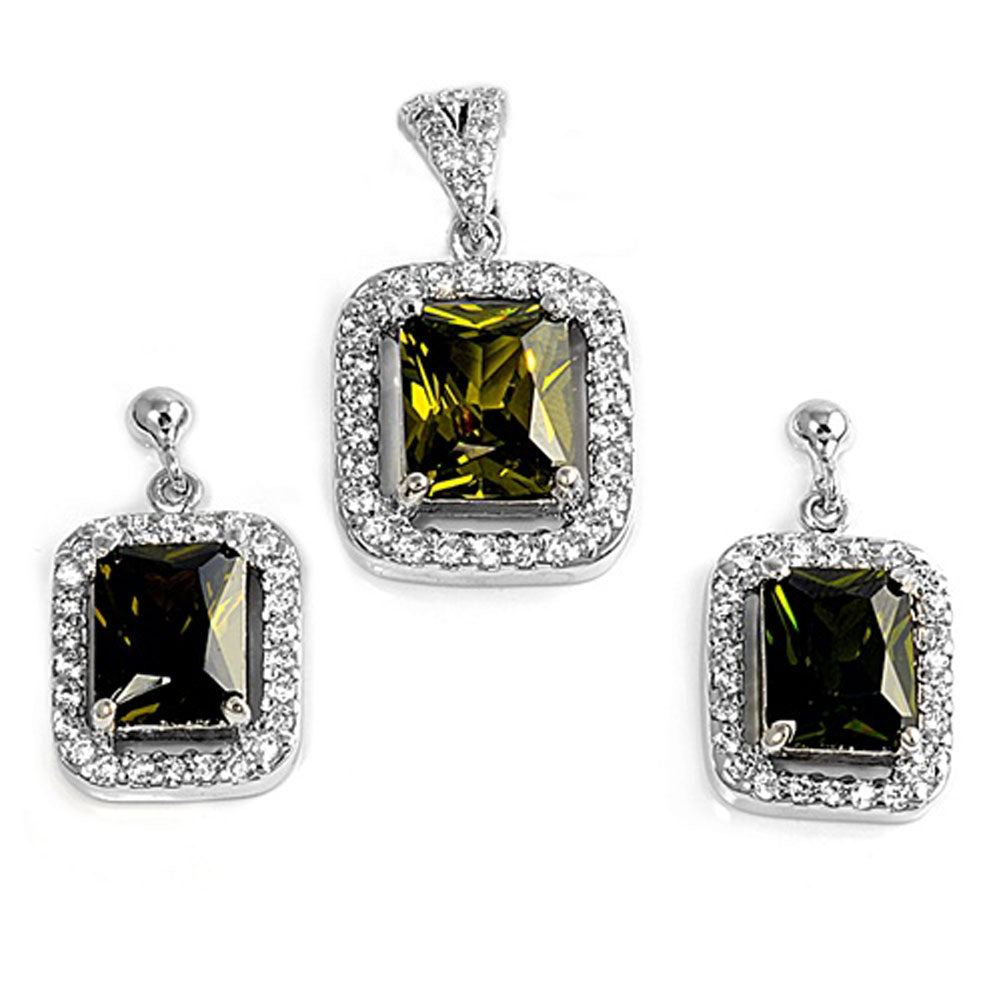Halo Rectangle Earrings Olive Green Simulated CZ Clear Simulated CZ .925 Sterling Silver Pendant Set