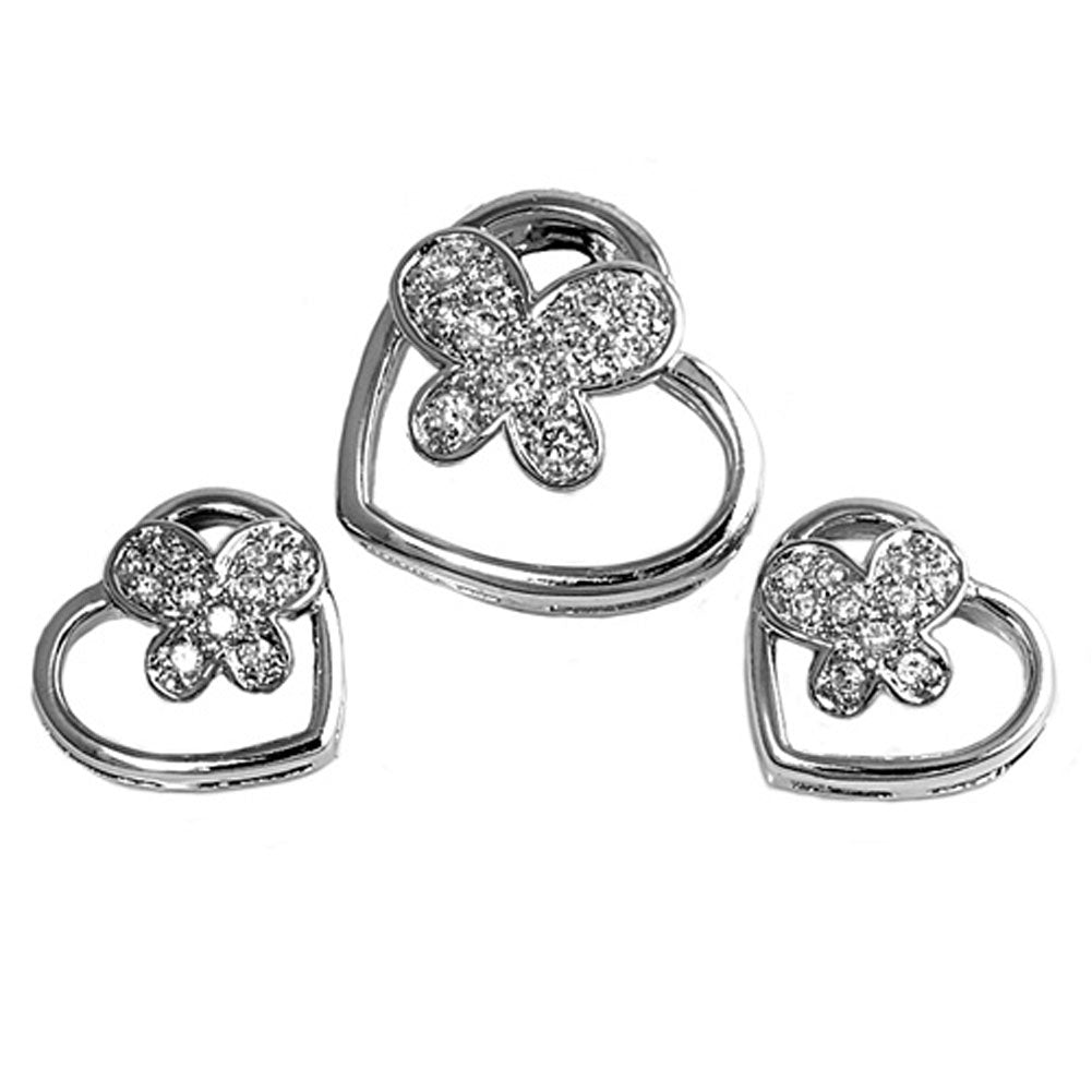 Butterfly Heart Earrings Clear Simulated CZ .925 Sterling Silver Pendant Set