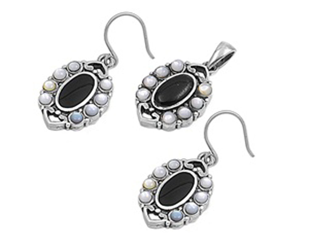 Oval Earrings Simulated Mother of Pearl Black Simulated Onyx .925 Sterling Silver Pendant Set