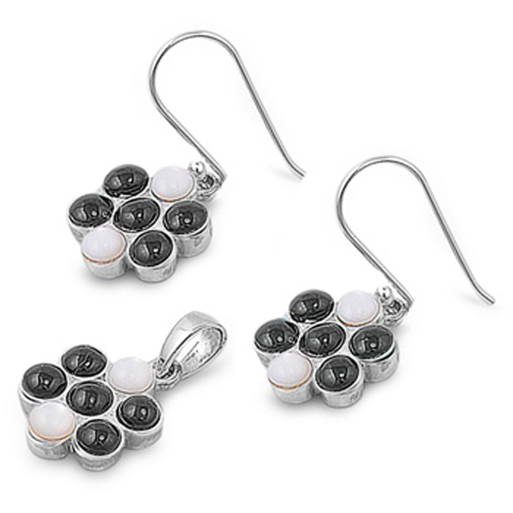 Flower Earrings Black Simulated Onyx Simulated Mother of Pearl .925 Sterling Silver Pendant Set