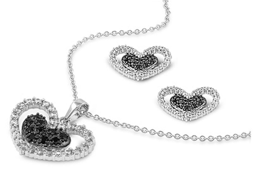 Heart Micro Pave Earrings Black Simulated CZ Clear Simulated CZ .925 Sterling Silver Pendant Set