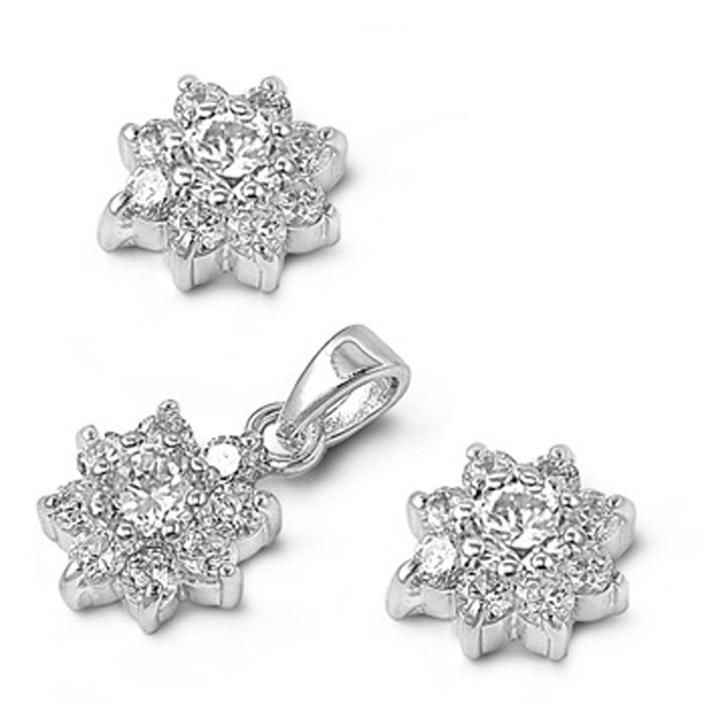 Flower Star Earrings Clear Simulated CZ .925 Sterling Silver Pendant Set