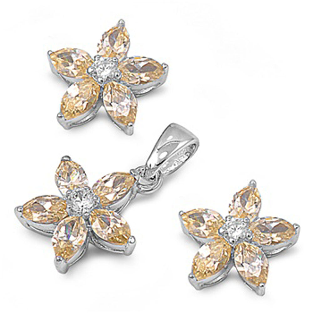 Flower Star Earrings Yellow Simulated CZ Clear Simulated CZ .925 Sterling Silver Pendant Set