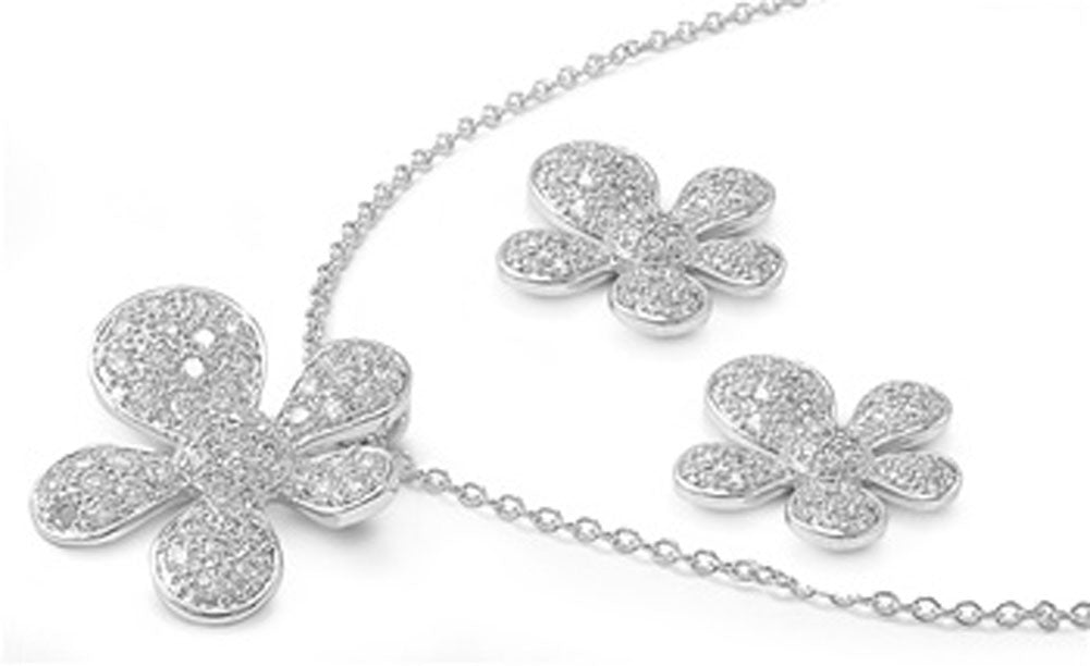 Micro Pave Flower Earrings Clear Simulated CZ .925 Sterling Silver Pendant Set