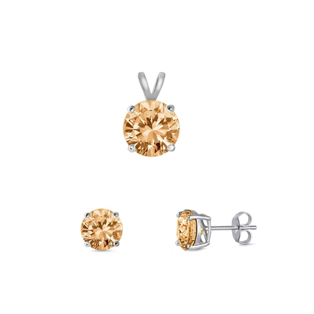 Solitaire Round Earrings Champagne Simulated CZ .925 Sterling Silver Pendant Set