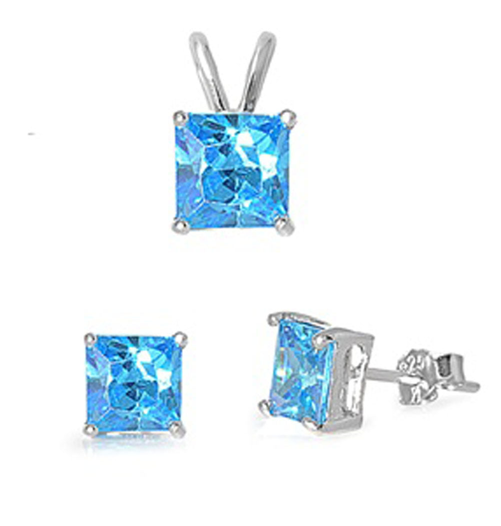 Solitaire Square Princess Cut Earrings Blue Simulated Topaz .925 Sterling Silver Pendant Set