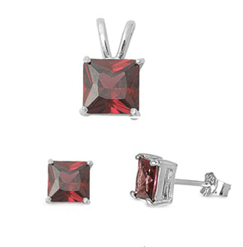 Solitaire Square Princess Cut Earrings Simulated Garnet .925 Sterling Silver Pendant Set